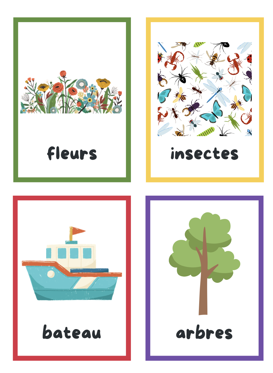 Lors de cette activité, les élèves devaient tirer une carte et dire à un camarade "Je dis... tu penses à...". Les cartes fournies avec le moyen, comporte des mots écrits. Cependant nos élèves ne savent pas encore lire et nous nous sommes dit que c'était trop difficile pour eux. J'ai donc créé des cartes avec des images des termes génériques. Les élèves travaillaient par 2, un élève tirait une carte, par exemple, les fruits et disait à son camarade : "Je dis fruits, tu penses à..." et l'autre pouvait dire "Je pense à une pomme".